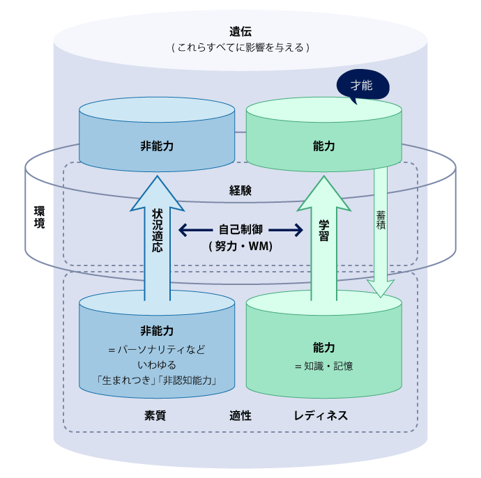 まず「非能力」とは、性格や気質のようなものです。コミュニケーションのスタイル、人当たりの良さ、努力ができるかどうか、といった特性です。これらには基本的に、その人が遺伝的に持って生まれた「セットポイント」があり、よほどのことがなければ大きくは変わりません。