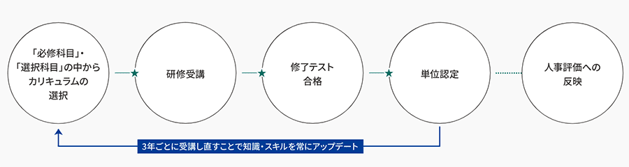 必修科目は必ず受講し、単位を取得しなければなりません。また、3年ごとに再受講して更新する必要があります。一度学んだ知識やスキルを継続的にアップデートするためです。