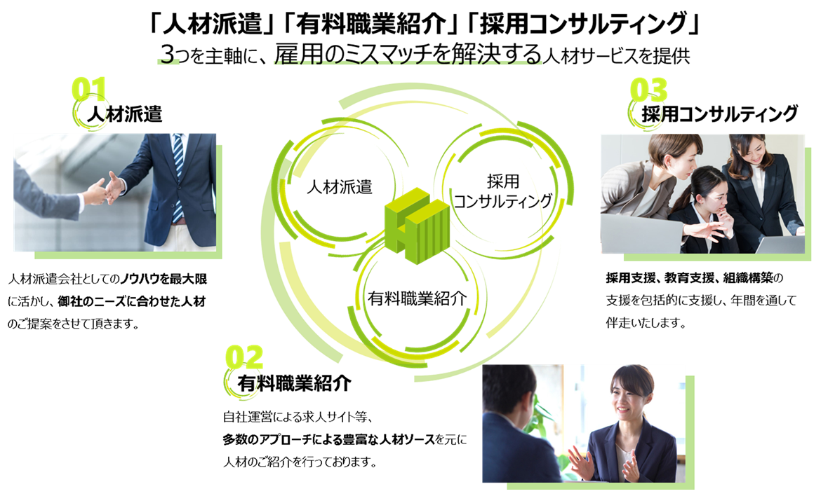 | 事業内容 | ・一般労働者派遣業 ・新卒・中途採用エージェント事業 ・採用コンサルティング事業 |