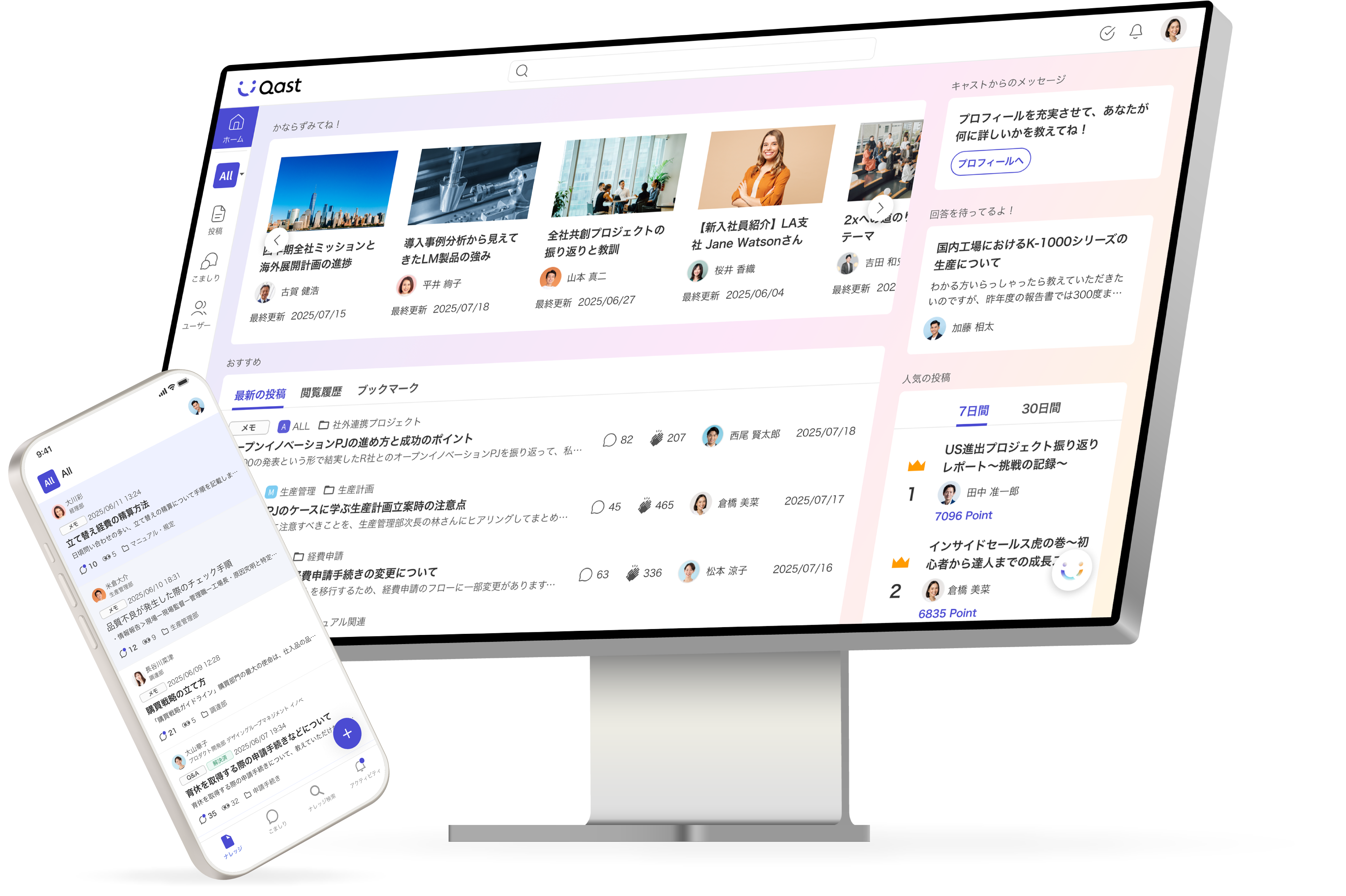 Qastは社内に埋もれる個人の知識や経験を引き出し、業務の効率化と企業価値の向上を実現するAIナレッジプラットフォームです。