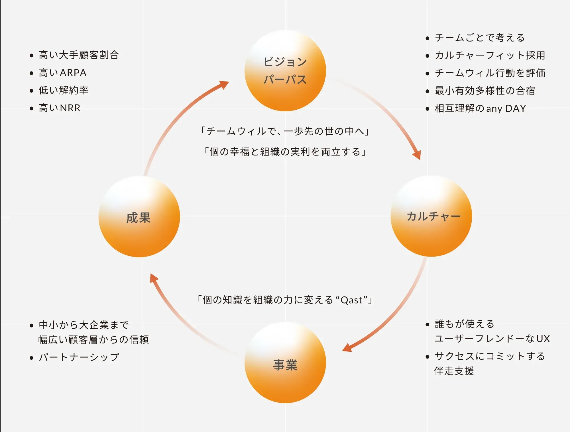 「個人のWillとVMVの重なり」を大切に、カルチャーを経営の柱に据え、AIナレッジプラットフォーム「Qast」を提供。