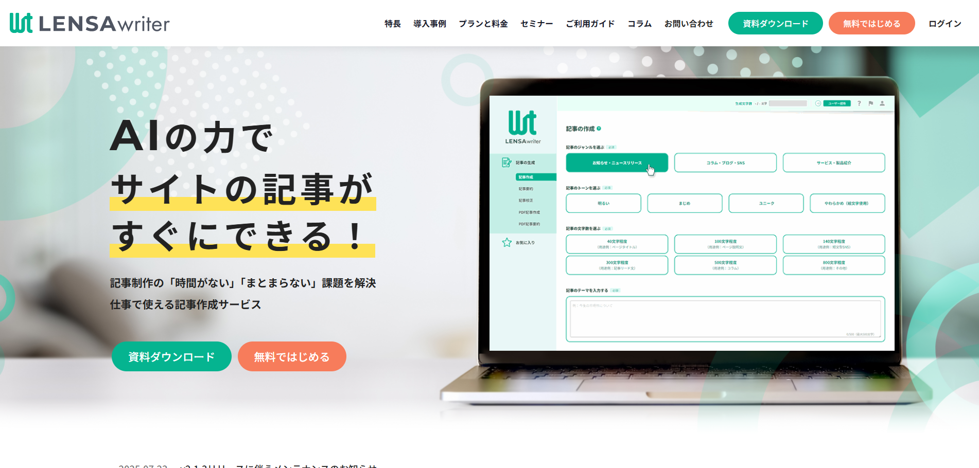 LENSAwriterは、記事制作における「記事を1から作成する時間がない」というような課題をAIの力で解決する、文章・画像生成サービスです。「プロンプトがAIに正しく伝わらない」とお悩みの方でも、テーマの入力やボタン操作で記事の生成が行えるため、用途に合わせた記事制作で理想に近い文章生成をサポートします。また、生成された記事がオリジナルであることを確認できる類似チェック機能も搭載しており、Webサイト上のコンテンツとして安心してご利用いただけます。