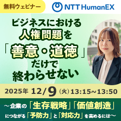 コンプライアンスの先へ!リスク管理から企業価値向上まで、「ビジネスにおける人権問題」を解決する予防力と対応力が身につく全社員向けeラーニングです。