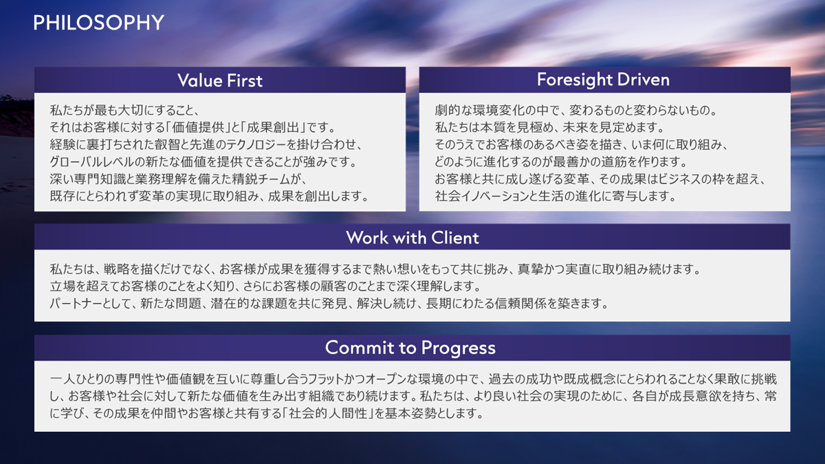 私たちは、戦略を描くだけでなく、お客様が成果を獲得するまで熱い思いをもって共に挑み、真摯かつ実直に取り組み続けます。
