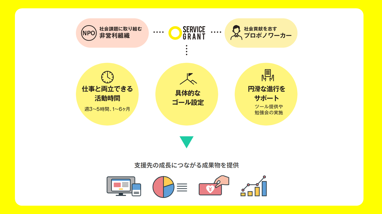 サービスグラントでは社会課題に直面している非営利組織に対し、マーケティング、広報、IT、人事、事業戦略立案といった職業上の知識や経験を持つ多彩な人々をコーディネート。企業にとっては、従業員が社会貢献を通じて新たな視点やスキルを習得し、エンゲージメントを高める機会となり、NPOにとっては、専門性の高い支援を得て、より効果的に社会課題に取り組むことが可能になります。このように、プロボノは単なるボランティア活動に留まらず、企業の人材育成や組織開発、そして社会課題解決の推進に貢献する、戦略的な取り組みとして位置づけられています。