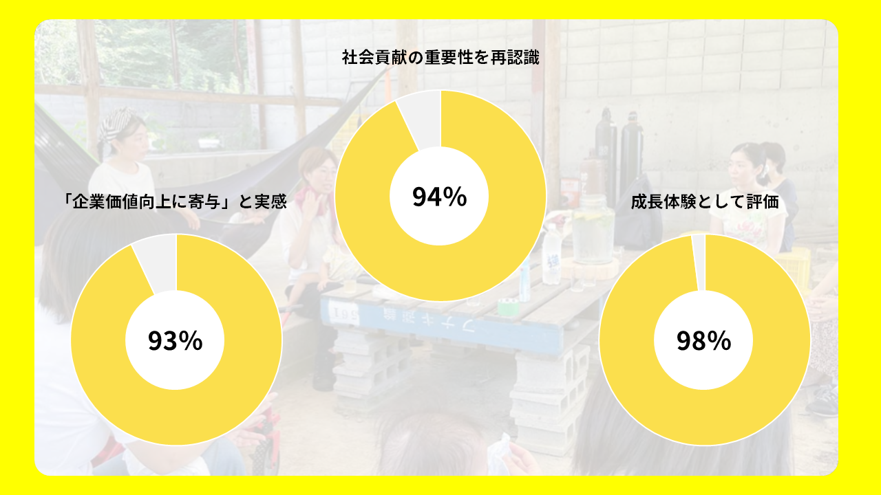 プロボノプログラムを通じ、多様な価値観との接触、社会課題への深い理解、実践的問題解決能力を体系的に獲得。参加者の98%が成長を実感し、93%が企業価値向上に寄与すると回答しています。