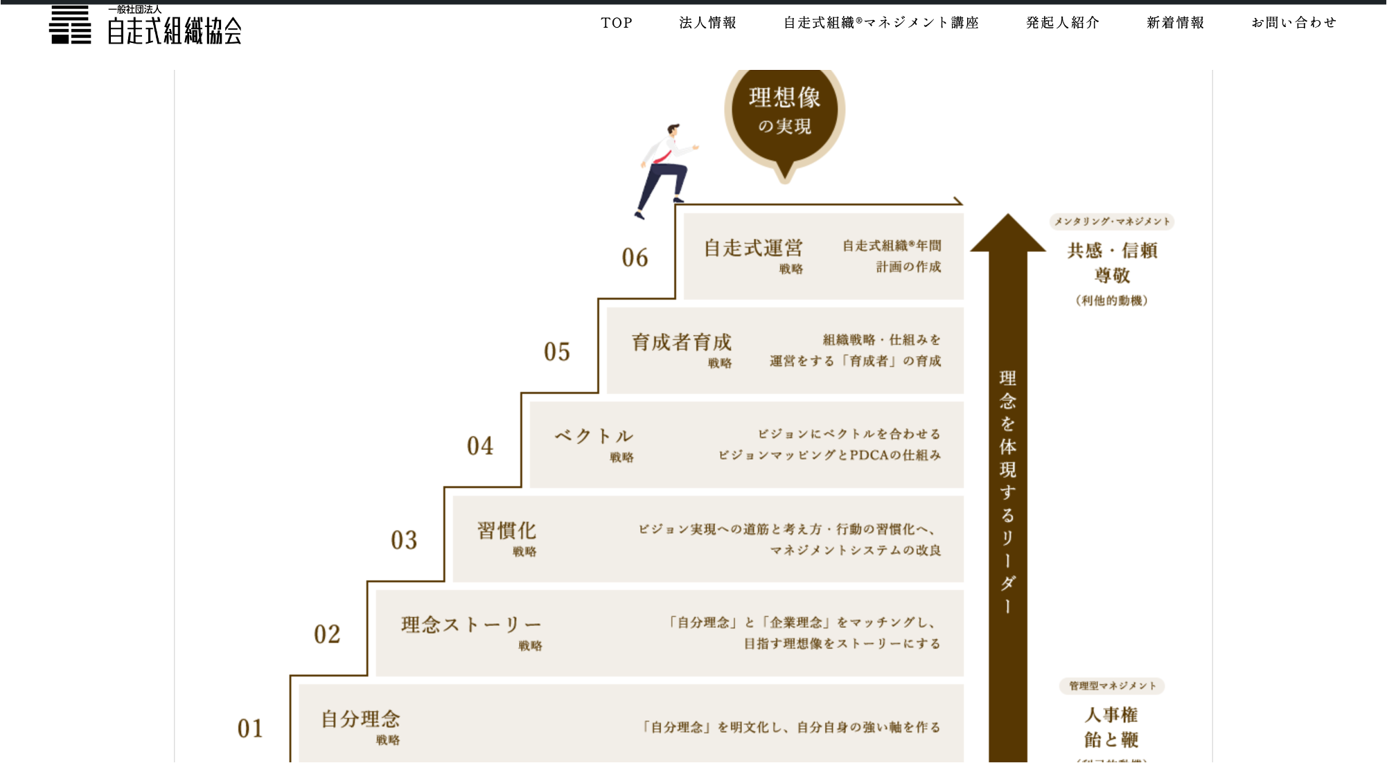人が育ち、「自分理念」と企業理念のマッチングから自らのビジョンに向かう個のマンパワーを組織のビジョンに統合する仕組みである「自走式組織」メソッドは、経営者の人と業績の悩みを同時解決する手法として公式認定され、商標登録。