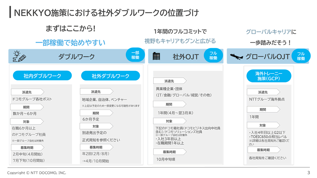 室住:「NEKKYO」は、社員の越境体験を体系化し、促進するための統合的なプログラムの名称です。コミットメントの度合いに応じて、大きく分けて「ダブルワーク」と「OJT」の2種類で構成されています。