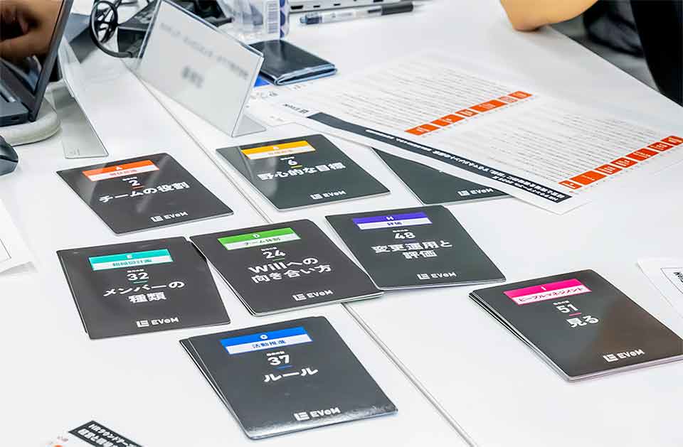 この分析を踏まえ、「自分ならどう行動するか」というテーマで、グループディスカッションが行われた。各グループにはマネジメントの具体的なアクションを示した「動作の型」のカードを配布。九つのジャンルに分類されており、特定された問題の要因に対して最適な「型」を選択し、解決策を考えるのに用いる。