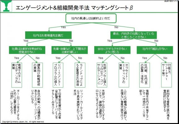 うちの今の組織の状態(状況)にあった手法はどれなのか。これを解決するのが当資料、「エンゲージメント&組織開発手法 マッチングシートβ」です。次ページ掲載の質問に、「はい」、「いいえ」で答えていくだけで、ぴったりの手法を見つけることができます。