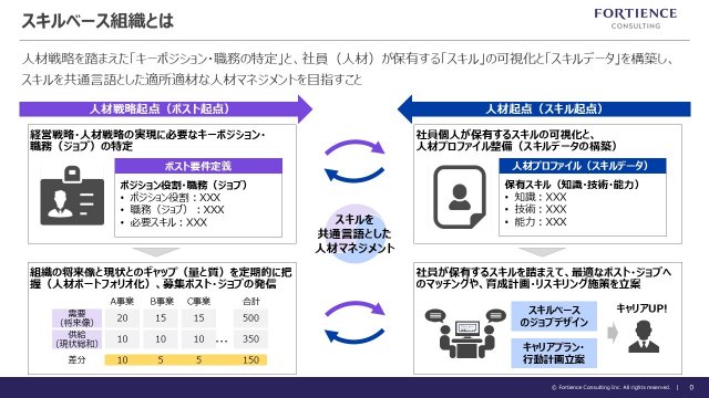 スキルベース組織とは、スキルを共通言語とした適所適材な人材マネジメントを目指すことを指します。
