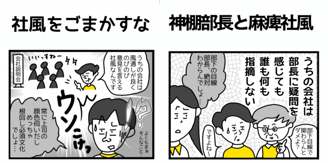 4コマ漫画でみる「社風」あるある (1)社風をごまかすな(2)神棚部長と麻痺社風【社内発信用漫画コラム】