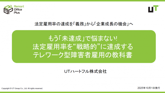 在宅勤務型の障害者雇用について、法定雇用率達成を「義務」ではなく「企業の成長機会」に変えるためのノウハウを解説します。採用・業務・定着における課題解決と、高い定着率を実現するUTハートフルの実績とサービスを紹介する資料です。