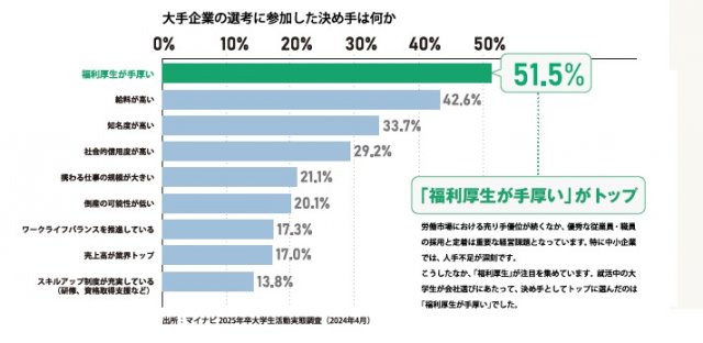 ・こうした中、「福利厚生」が注目を集めている。就活中の大学生が会社選びにあたって、決め手としてトップに選んだのは「福利厚生が手厚い」となっています。