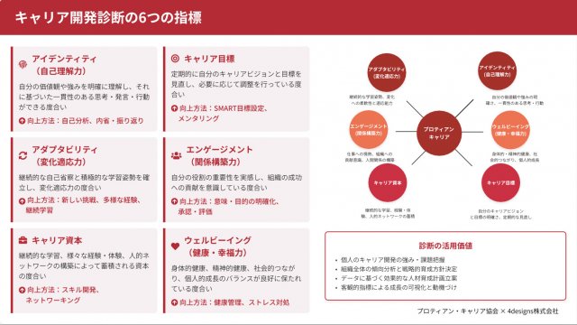 また、プロティアン・キャリア理論に基づく「6つの指標」によるキャリア診断を通じて、成長の可視化・課題の特定・施策効果の測定が可能です。これにより、個人は自律的なキャリア形成を促進し、組織は人材開発戦略をデータドリブンに最適化できます。