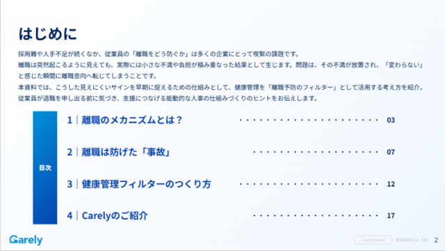 本資料では、こうした見えにくい離職サインを早期に捉えるため、健康診断やストレスチェック、労働時間などの「健康データ」を「離職予防のフィルター」として活用する考え方をご紹介します 。