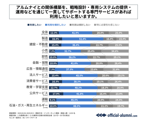 日本型の終身雇用制度が揺らぎ、人材の流動性が高まる中で、企業が退職者(アルムナイ)との関係構築に注力する動きが広がっています。本調査では、業界ごとに異なる人材特性や流動性に着目し、1次産業を除く12業界の採用担当者を対象に、アルムナイとの関係構築に関する実態や意識の違いを明らかにしています。