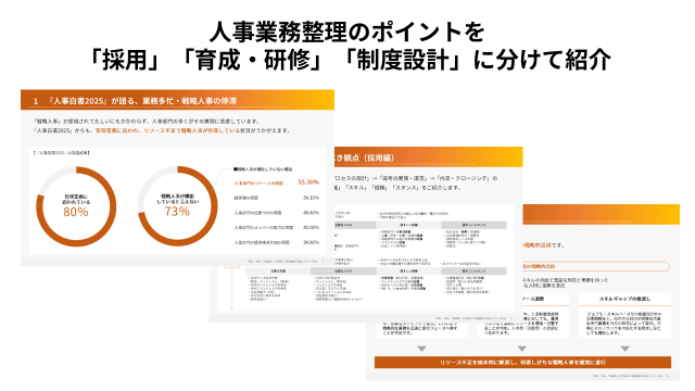 リソース不足解消の糸口は、適正な業務プロセスに沿って自社に必要な要素を可視化すること。具体的な手法について「採用」「育成・研修」「制度設計」の3つの切り口で解説します。リソースの確保や分配のバランスにお悩みのマネージャーや部門責任者をはじめ、広く人事部門の現状に課題意識を持つ方におすすめの資料です。