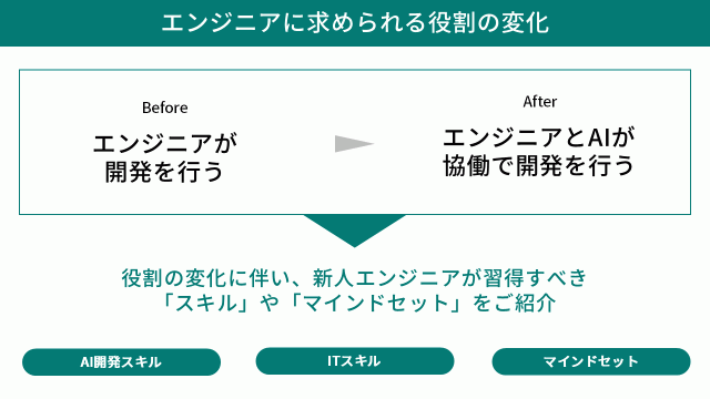 AIを活用して開発業務を遂行できるエンジニアは、これまでとは異なる「スキル」や「マインドセット」が求められています。「エンジニア自身の開発」から、「AIとの協働」へ、開発プロセスが大きくシフトしている現代にふさわしい新人エンジニアの育成ポイントを、分かりやすくまとめました。