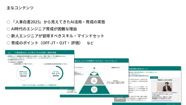 この問題の解決のヒントをご提供するのが本資料です。AI時代に新人エンジニアが習得すべきスキルとマインドセットを紹介するとともに、育成効果を高める実践的なヒントも掲載。「これまで」と「これから」の違いを分かりやすく紹介し、次の打ち手が見えてくるコンテンツとなっています。