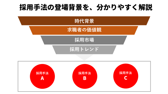 こうした課題解決のヒントになるのが、本資料です。各採用手法の概要とあわせ、なぜその手法が登場・注目されたのか、歴史的な背景も理解できるような構成となっています。
