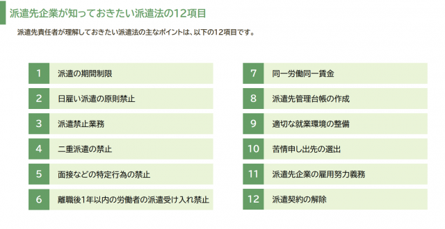 派遣先責任者や派遣社員の管理担当者向けに派遣先が知っておくべき派遣法の12項目について解説した資料です。