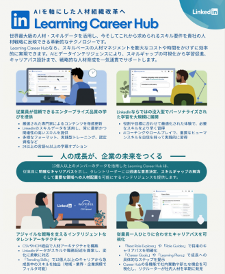 13億人以上のメンバーデータを活用する LinkedIn Learning Career Hub は、従業員に明確なキャリアパスとパーソナライズされた学習機会を提供。さらに、組織リーダーにはスキルギャップの解消や的確な人員配置を可能にするインテリジェンスを届けます。