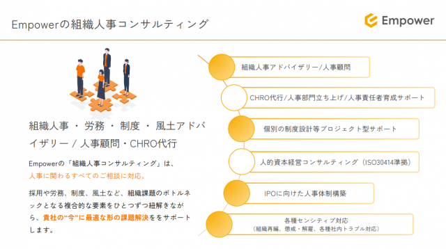 - 組織人事課題は企業フェーズにより重要性や解決策が大きく変わります。当社はスタートアップや中小企業に精通したコンサルタントが、組織の実態に即した支援を提供します。