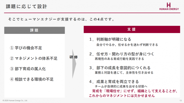 - それぞれの成長フェーズに応じた内容で構成が可能です。リーダーとしての第一歩から、マネジメントの中核を担う段階まで、実践的なスキルを習得できます。