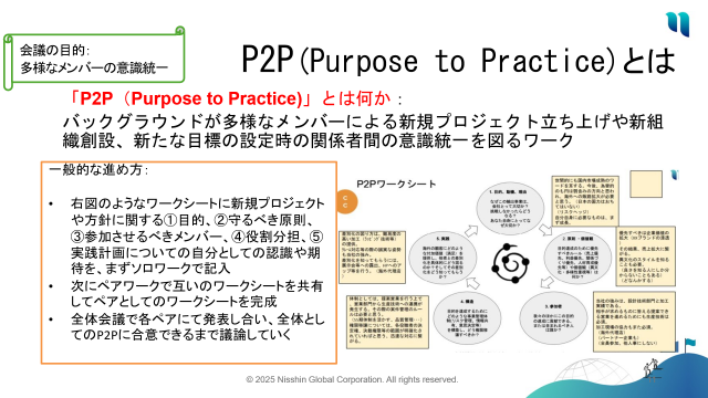 下図(「Purpose to Practices(P2P)というワークショップの様子」)