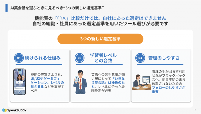 そのうえで、AI英会話を選ぶ際に見るべき新しい選定基準として、「続けられる仕組み」「学習者レベルとの合致」「管理のしやすさ」という3つの視点を提示しています。社員が自発的に学び続けられる設計になっているか、初級〜中級者を中心とした実際の社員レベルに合っているか、人事が学習状況を把握・フォローしやすいかといった点を、具体例を交えて整理しています。