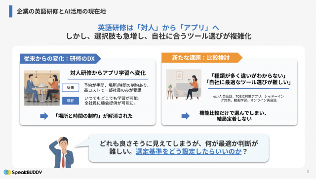 法人向けの英語学習サービスは年々選択肢が増え、AI英会話、オンライン英会話、動画学習、TOEIC対策アプリなど、多様なツールが登場しています。一方で、「導入したものの利用が定着しない」「結局、成果が見えないまま終わってしまった」といった声も多く、ツール選定そのものが難しくなっているのが現状です。