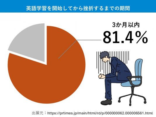 当社の調査によると、英語学習で挫折経験のある人のうち、約8割もの人が3カ月以内に挫折しているという実態が明らかになりました。その要因は大きく3つあり、個人のやる気や素養でカバーするだけではこれらを克服するのは非常に困難といえます。