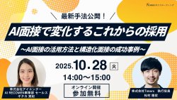無料オンラインセミナー|AI面接で変化するこれからの採用 〜AI面接の活用方法と構造化面接の成… | 『日本の人事部』 [無料WEBセミナー]本ウェビナーでは、AI面接を効果的に活用するための採用設計と、 構造化面接の考え方・データを実務でどう活かすかを事例と共に解説します。