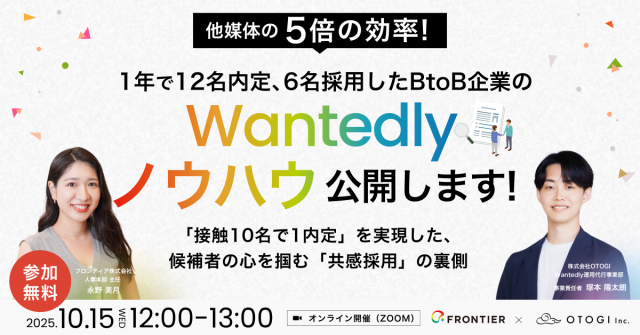 今回は、Wantedlyで採用を成功させたフロンティア社の採用担当である永野さんをお呼びし、OTOGIとどのように連携し、どのように運用したのか。そして、どのような成果が出たのかなど、当事者としてのリアルな声をお伺いいたします。