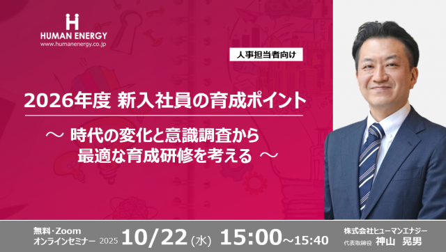 本セミナーでは、こうした最新の学生像と背景となる社会環境を踏まえたうえで、2026年度新入社員研修において反映すべき「新しい視点」と、時代が変わっても普遍的に求められる「育成の軸」を整理してお伝えします。