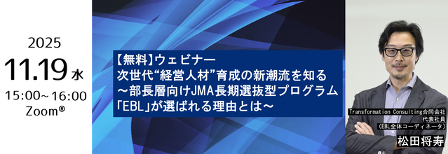 当ウェビナーでは、Transformation Consulting合同会社・代表社員の松田将寿氏(EBL全体コーディネータ)に、「次世代の経営人材(部長クラス)を取り巻く現状と課題」「変革をリードする経営人材に求められる要件や育成手法」等を解説していただきます。