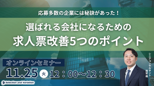 そんなお悩みをお持ちの方へ。実は「選ばれる企業」になるためには、求人票の“伝え方”に工夫があります。本セミナーでは、応募が集まる企業に共通する求人票改善の5つのポイントを、実際の事例を交えてわかりやすく解説します。