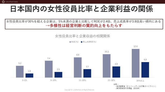 2030年までに女性役員比率を30%に引き上げる目標が掲げられ、