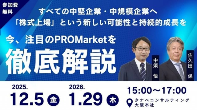 本説明会では、 プロマーケット上場プロセスの全体像や得られるメリット、成功のポイントを事例を用いながら実践的に解説します。