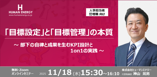 本セミナーでは、こうした現場の課題に対し、「目標設定」と「目標管理」の要諦を軸に、「管理職が何を理解し、どう部下を導くべきか」という観点から、教育・支援の仕組みを整えることの重要性を解説します。さらに、実際の研修や企業事例を交えながら、運用を「仕組み」から「文化」へと変えるためのステップを紹介します。