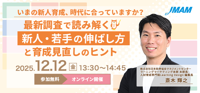 最新調査や過去との比較をもとに、新人・若手(Z世代)の意識変化を読み解きつつ、離職を防ぎ、前向きに成長し続ける人材を育てるためのヒントやJMAMの新しい取り組みも含めた具体的な育成施策をお伝えします。