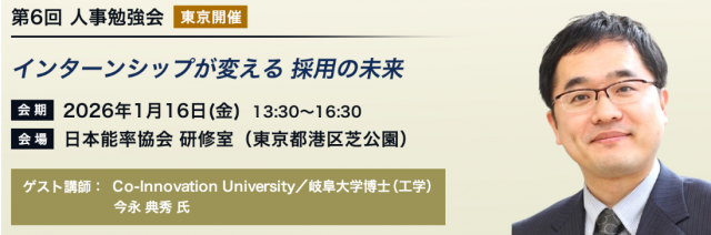一般社団法人日本能率協会(JMA)人事・人材開発セミナー事務局では、人事や組織の課題解決の一助となるようゲスト講師をお招きし、参加者間の気づきと学びを創出する場「JMA人事勉強会」を2024年により開催しております。第6回は、インターンシップのあり方と採用の未来をテーマに開催いたします。