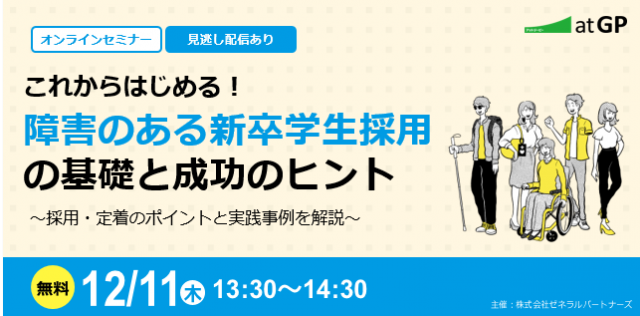 本セミナーでは、これから障害のある新卒学生の採用を始めたい企業様に向けて、採用の全体像や押さえるべきポイント、そして実際の成功事例を分かりやすく解説します。