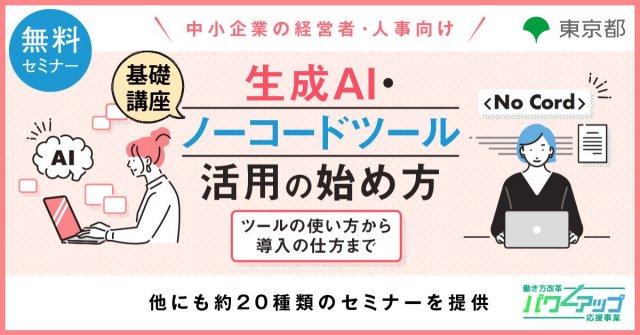 日々進化を続け、世の中に浸透しつつある生成AIやノーコードツールの基礎的な使い方と業務効率化のヒントをお伝えします。(東京都主催/働き方改革パワーアップ応援事業)