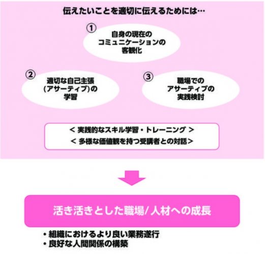 「伝えたいことを適切に伝える」というコミュニケーションの本来的な姿に向けて、多様な受講者とともに実践的な知識・スキル学習やトレーニングを行い、活き活きとした職場や人材への成長に向けた第一歩を踏み出します。