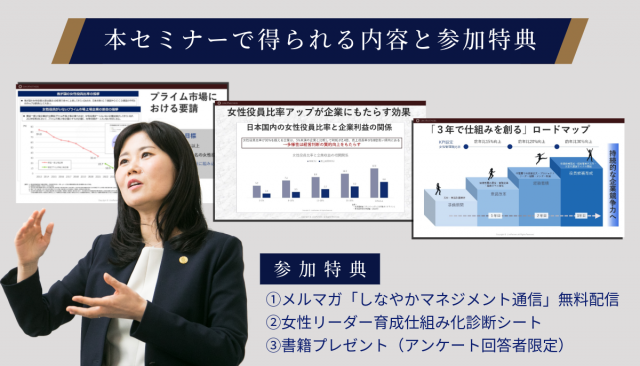 | 特典 | 【特典1】メールマガジン「しなやかマネジメント通信」無料配信 【特典2】女性リーダー育成仕組み化診断シート 【特典3】書籍プレゼント(アンケート回答者限定) |
