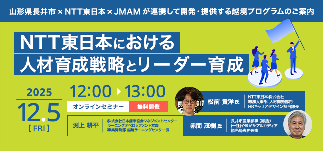 NTT東日本とJMAMは協働で越境学習型のリーダー育成プログラムを企画・開発しました。NTT東日本松前様に同社における人材育成課題と戦略、リーダー育成における越境学習の可能性についてお話いただきます。