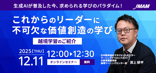 本セミナーでは、社外の人、異なる価値観に触れて、思考の枠組みを拡張する「越境学習」をご紹介します。必要とされるスキルを育成する「新たな学びのパラダイム 越境学習」を提示します。