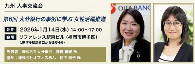 そこで、第6回の九州人事交流会では、株式会社大分銀行の人財開発部 ダイバーシティ推進室 室長神崎 真紀 氏にお越しいただきます。大分銀行が実施している「女性活躍推進」の取り組みから学び、その事例を通じて、企業がどのように女性のキャリア形成を支援し、職場におけるダイバーシティを推進していくかを考えます。そして、大分銀行での支援も行う株式会社オフィスあんの代表取締役 松下直子氏による問いかけや情報提供により、参加者同士のディスカッションを促します。